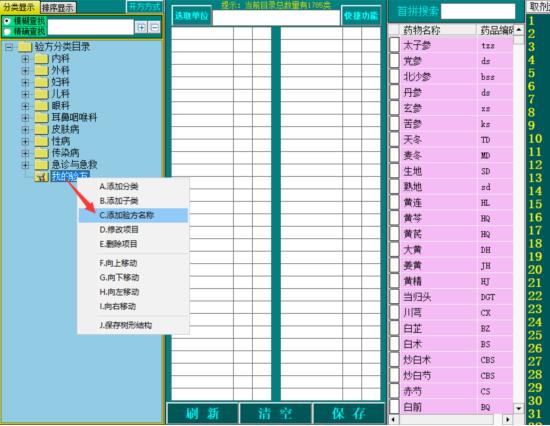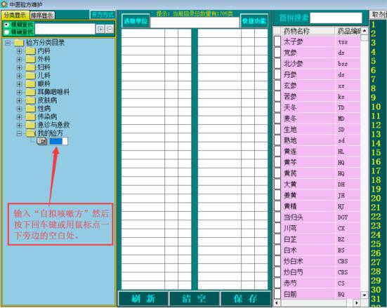 例如:我要新增一个自己的验方为“自拟咳嗽方”在“我的验方”分类下。那么就必须先建一个“我的验方”分类,然后在“我的验方”分类下添加“自拟咳嗽方”即可。