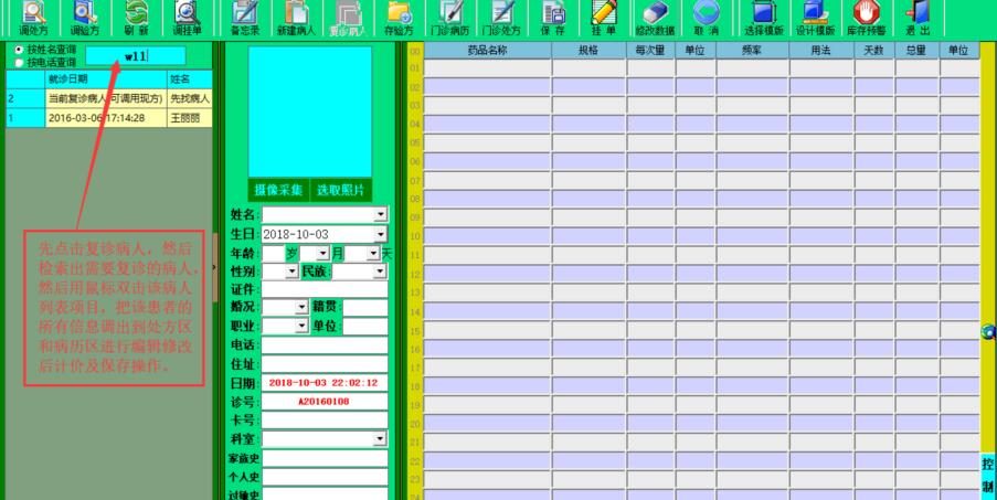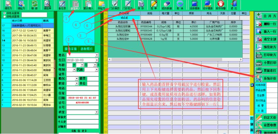 (2) 如何新建一个病人,步骤如下: 首先点击“新建病人”按钮——输入患者基本信息——开出处方——写出病历——点击“系统计价”按钮进行系统计价——最后点击保存按钮。 首先要点击“复诊病人”按钮——左侧表格会弹出一行提示——在首拼搜索输入框内输入患者姓名的首拼进行查询——找到该患者后用鼠标点击它即可调入该患者进行复诊操作——对患者的处方、病历修改或重写后点击保存按钮即可完成复诊病人操作(如果需要计价请点击系统计价按钮后在保存)。
