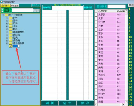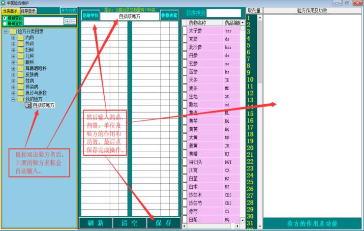 例如:我要新增一个自己的验方为“自拟咳嗽方”在“我的验方”分类下。那么就必须先建一个“我的验方”分类,然后在“我的验方”分类下添加“自拟咳嗽方”即可。